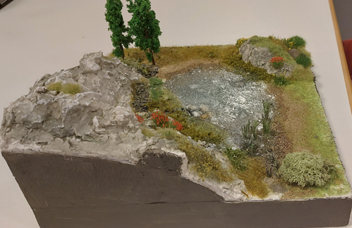 Ein Schüler versuchte sich unter Anleitung von Hans Peter Ziemeck in der Schöpfung einer Urzeitlandschaft mit einem Urelefanten. Eine Wasserstelle war wichtig, also wurde sie als erstes auf die Platte gemalt.