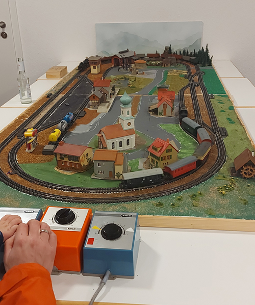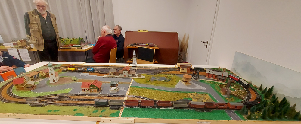 Im Gemeindehaus war die große Weihnachtsanlage von 2024 zu sehen. Noch nicht ganz fertig aber schon sehr schön ist die Anlage , die die Modellbahn-AG der Dünsbergschule in Erda gebaut hat. Sie verspricht weiße Weihnachten.